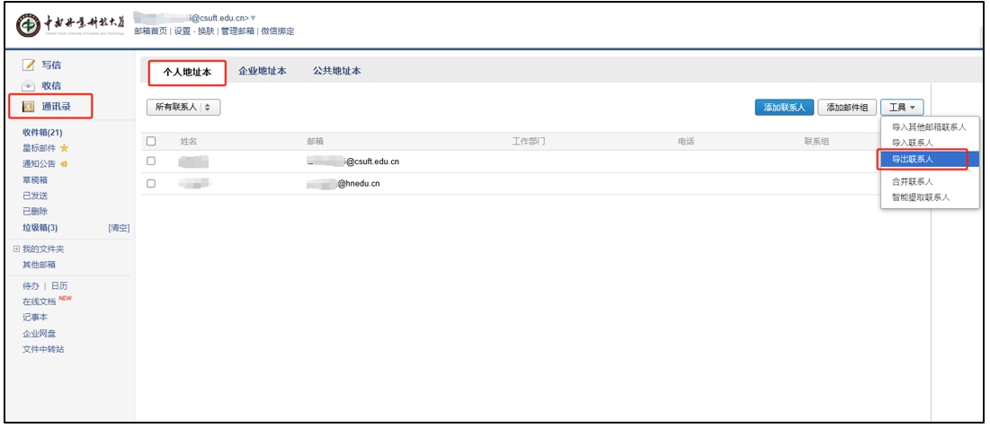 第一步:如图进入邮箱后,选择通讯录 → 个人地址本 → 工具→导出联系人