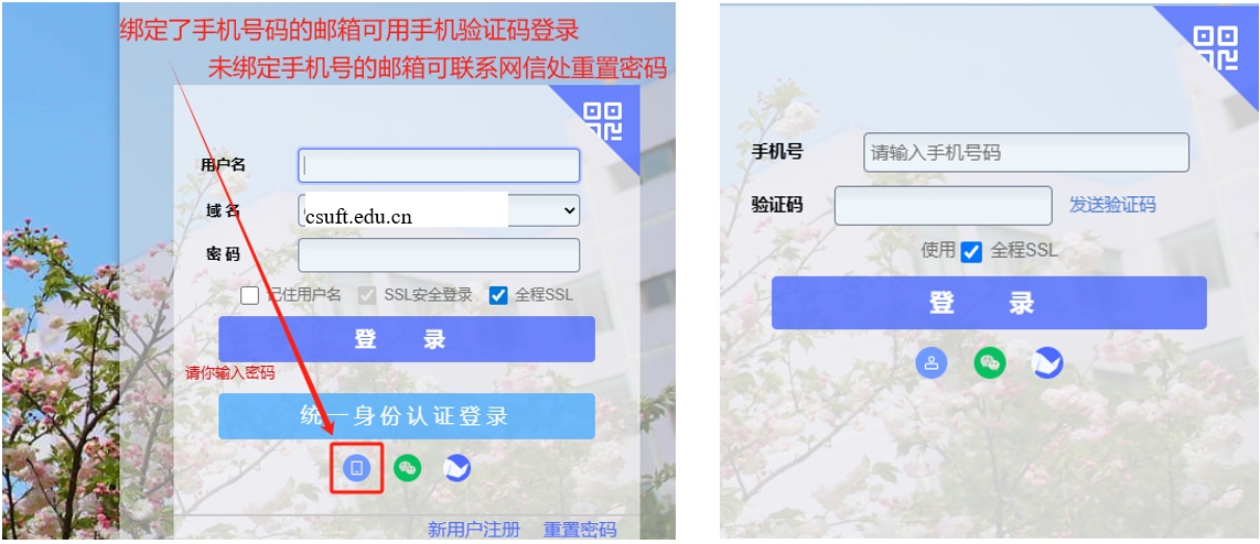 在浏览器地址栏中输入邮箱地址https://mail.csuft.edu.cn,并按提示用手机验证码(或输入用户名密码)进入邮箱。